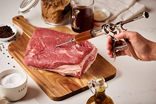 - ✔︎ FLAVOR ENRICHMENT – Includes 4 stainless Steel Commercial Grade twist lock Needle Syringes. (1) 6 inch needle with 12 small holes for liquids (1) 6 inch needle with a large hole for injecting marinades with herbs, spices, garlic, ginger, etc. (1) 4 inch needle with 2 small holes for precision applications (1) 3 inch needle with 2 larger holes.