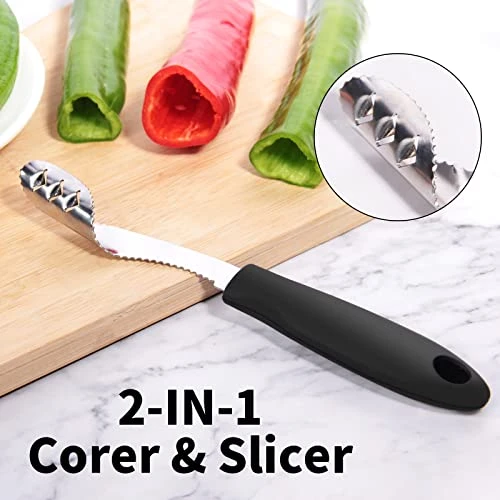 - 【Two Different Blade Design】The rotating serrated blade design of pepper corer can help you to remove the core of the pepper perfectly. The 4.61 inch vertical serrated blade of zucchini/cucumber corer is designed to reach the depth of the vegetables and fruits. Combination of the two works will be better, make the treatment of each vegetable is clean, complete and fast.