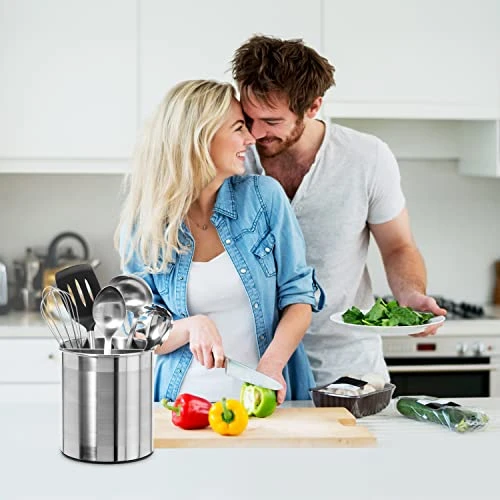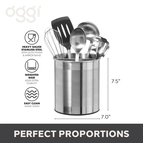 - GREAT VALUE: Utensil holder is 7″ in diameter with a height of 7.5″. BPA-free, non toxic, chemical and lead-free. High quality modern satin stainless steel, trimmed with mirror bands, complements any kitchen design.