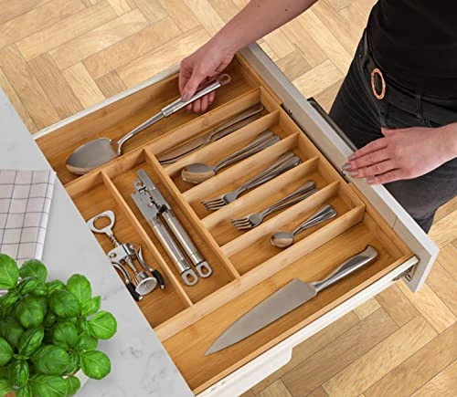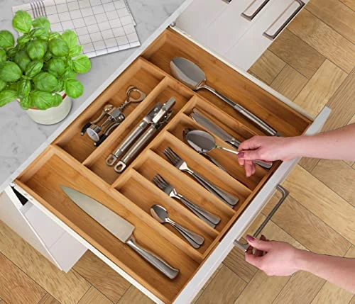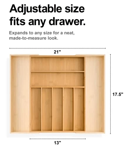 - ADJUSTS TO ANY SIZE FOR A MADE-TO-MEASURE LOOK – Our kitchen drawer organizer is expandable from 13 inches to 21 inches wide to fit any size drawer for a smart custom-made look. Organize flatware, kitchen gadgets and utensils or bring order to the dreaded junk drawer and unruly office desk drawers.