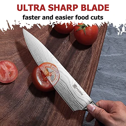- 【Sturdy Pakkawood Handle】 In order to avoid wooden handles tend to crack, split and discolor. PAUDIN chooses Pakkawood, which has high strength and durability, to make the handle of the chef knife set. Excellent wooden handle with ergonomic design, knife sets is non-slip and comfortable to hold. Cut or slice with confidence.