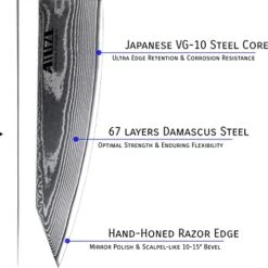 Chef Knife – 8″- Japanese VG10 Steel Core Hammered Damascus Blade – With Sheath & Case