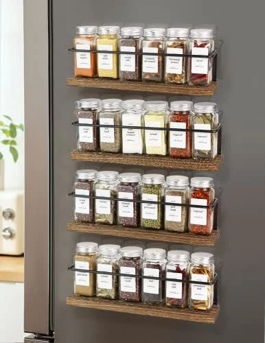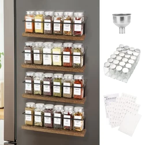- 【EASY ASSEMBLE】The magnetic rack is already assembled, making it easy to set up in your kitchen. The included steel funnel makes it easy to fill up the spice jars without making a mess on your countertop.