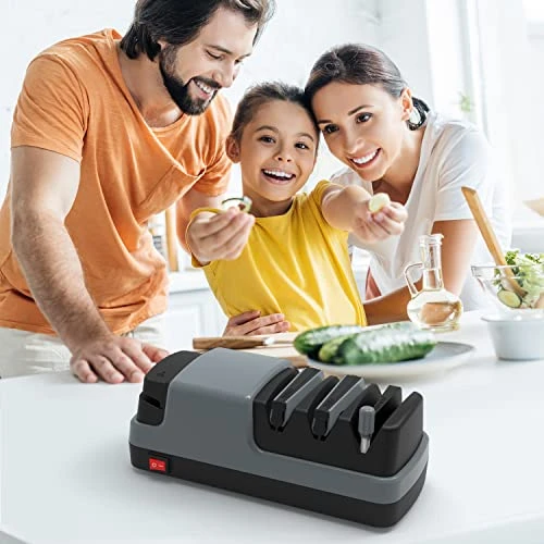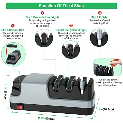 - ✅Reasonable Design: There are 4 slots. 100% diamond grinding wheel in slot 1, slot 2 and slot 4 , restores the sharpness of the blade, ceramic polishing rod in slot 3 for polishing. The back cover of the slot 4 can be removed, for grinding other tools, such as garden scissors or axes etc. With low noise, the operation of electric knife sharpener is easy and labor-saving, making it safer for women and elderly people. With attractive shape, very suitable for personal use or as a gift.