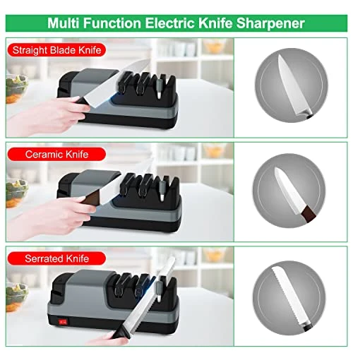 - ✅Ideal for a Variety of Knives: Our electric knife sharpeners are suitable for several kinds of straight blade knives(chef knives, fruit knives, cleaver etc.), serrated knives, ceramic knives, scissors(kitchen scissors, garden scissors, axes, etc.). In addition, a detachable ceramic polishing rod is added for grinding special-shaped tools, and can also be used for polishing.