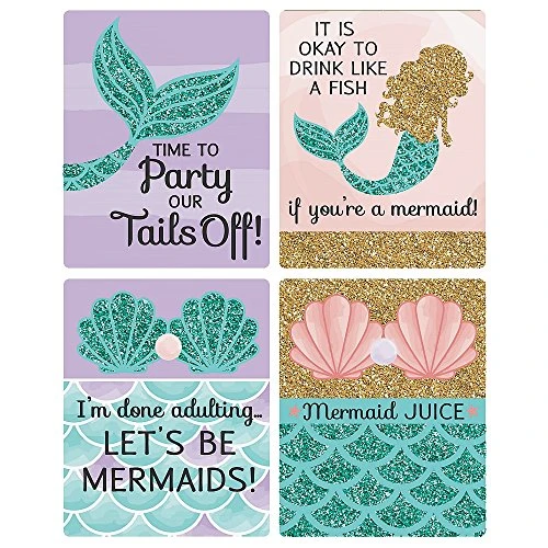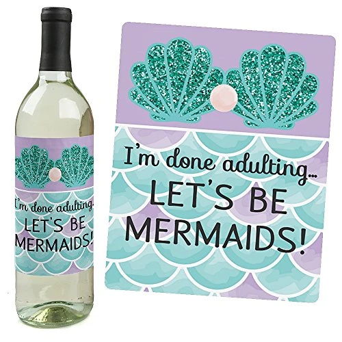 - UNIQUE BABY SHOWER OR BIRTHDAY GIFT IDEA: Mermaids and Shells Wine Bottle Labels also make a great gift idea. Add Let’s Be Mermaids Wine Bottle labels to a favorite bottle of wine or spirits for a special baby shower gift. Use each wine label on a favorite beverage bottle and gift individually or create an impressive birthday gift basket using all 4 labels on coordinating wine or liquor bottles. Wine bottle labels will easily give your baby shower or birthday gift a personal touch!