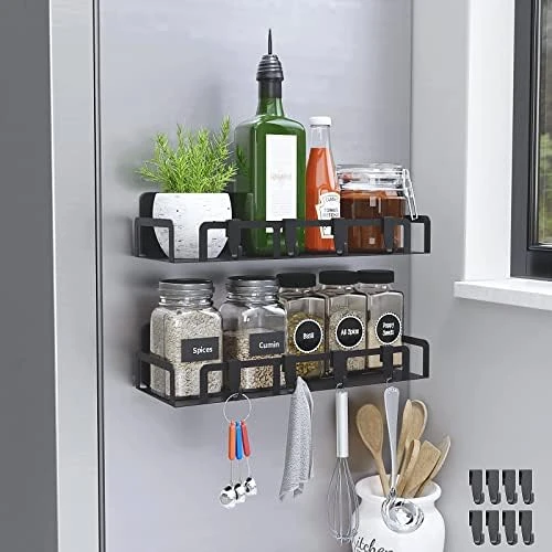 LokRoad Magnetic Spice Rack For Refrigerator, 2 Pack Moveable Magnetic Fridge Shelf With 8 Hooks And Strong Magnet, Black