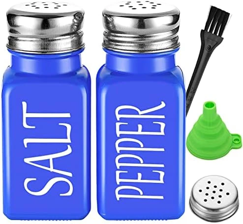 - 🎄This cute blue salt and pepper shaker is made of high quality glass with a high quality stainless steel lid. It additionally comes with two spare stainless steel lids that fit perfectly. This salt and pepper shaker individually measures 1.57in x 1.57in x 3.54in, it is small, cute and easy to hold and use.