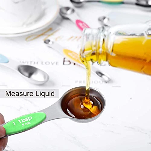 - Kitchen measuring spoons for cooking and the leveler have a magnetic center which allows for easy nesting and space saving. The magnetic feature of these metal measuring spoons snap easily together so you can store them all in one section of your drawer. No more hunting for spoon measurements and no more clumsy clips, rings or chains to deal with