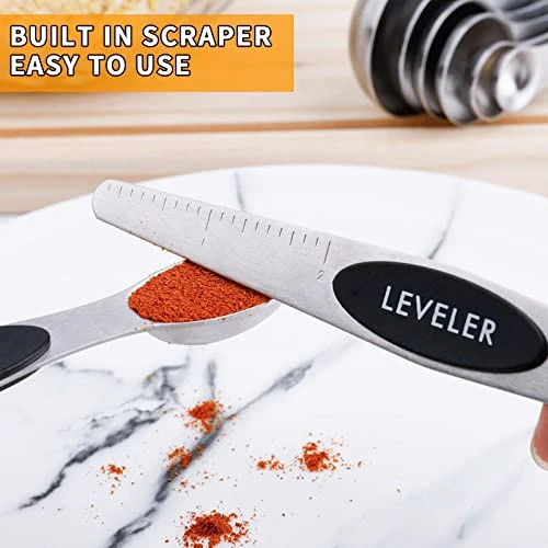 - 👨🍳[Double-Headed Design] – Each stainless steel measuring spoon comes with a round spoon on one end and a narrow shaped spoon on the other. There is usually a recipe that calls for a liquid and a dry teaspoon ingredient, for instance a tbsp of flour and water. While cooking you can use one side for dry and the other for wet ingredients, so there is no need to clean, dry wet spoons or have multiple spoons out.