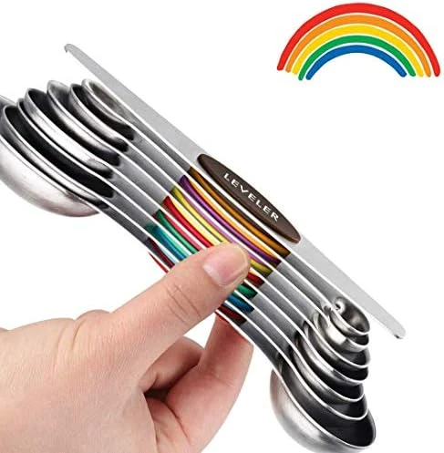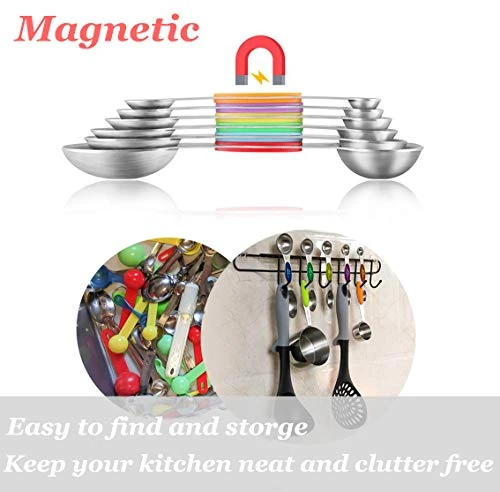 - โ EXCELLENT MAGNETIC DESIGN—-Each measuring spoon has a magnetic colourful handle allowing it to be easy detached and attached. the magnets are strong enough to fasted securely to any metal surface, so it ‘s easy to find and ready for next time use from the drawer in kitchen, save space and store orderly, The beautiful and convenient design is designed to make this measuring spoon your best kitchen helper. Colourful kitchen, colourful mood!