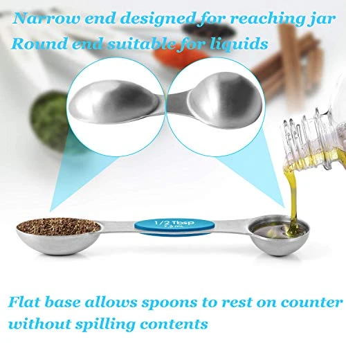 - โ VERSATILE DOUBLE-SIDED USE—-Designed to handle and provide accurate measurements with dry and liquid ingredients.โถROUND end measuring liquid ingredientโทnarrow OVAL end can fit in spice jars or bottles. The rounded end can also be used to make ice cream balls and fruit balls.///With flat base that can sit scoops stably on the counter without tipping over or spilling the spices. It can help you to do any ingredients that require precise measurements, coffee, tea, spices, olive oil, sugar, salt