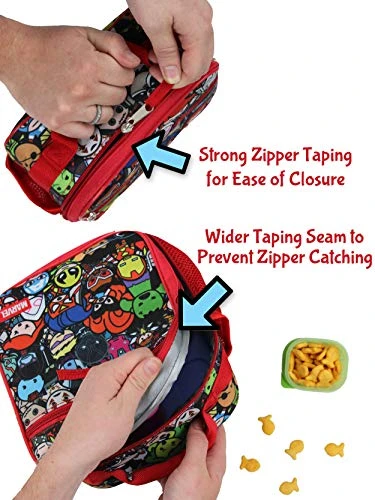 - HIGH QUALITY & WELL CONSTRUCTED – This Avengers lunch bag features one large main zipped compartment, a small front zip pocket for snacks and other accessories, a side mesh pocket, and a padded holding handle for easy carrying. The side mesh pocket is made from durable athletic mesh, and the bag is reinforced with nylon for added strength. This awesome lunch bag is stitched with a durable nylon thread for extra durability.
