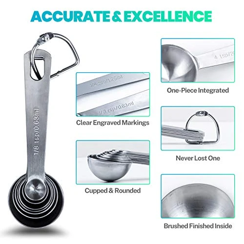 - Spoons combination:1/8 tsp (0.63ML), 1/4 tsp (1.25ML), 1/2 tsp (2.5ML), 3/4 tsp (3.75ML), 1 tsp (5ML), 1/2 tbsp (7.5ML), 1 tbsp (15ML)