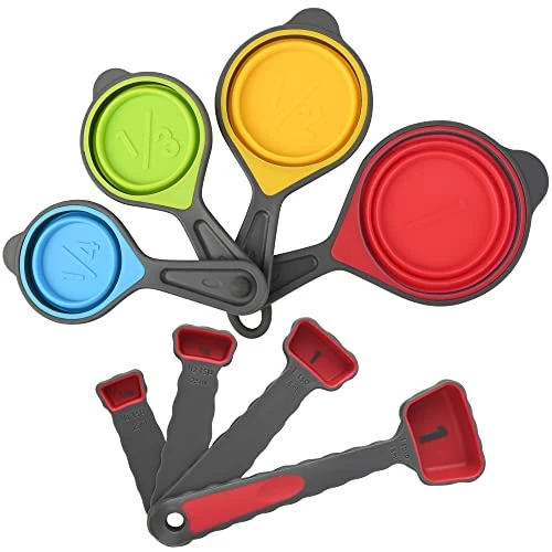 Provide accurate capacity for baking and cooking, collapsible measuring cups for space-saving storage. - Complete collapsible measuring cups set: 4 silicone measuring cups: 1/4 cup (60 ml), 1/3 cup (80 ml), 1/2 cup (125 ml), 1 cup (250 ml) ;