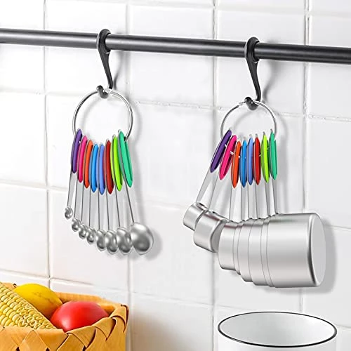- 🌻[EASY TO STORE] The cups and spoons each stacked in one bundle with a removable stainless ring which makes them easy to store in the cabinet or hang on wall, and you can easily take apart to use them when you need.
