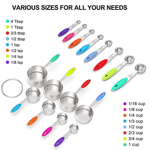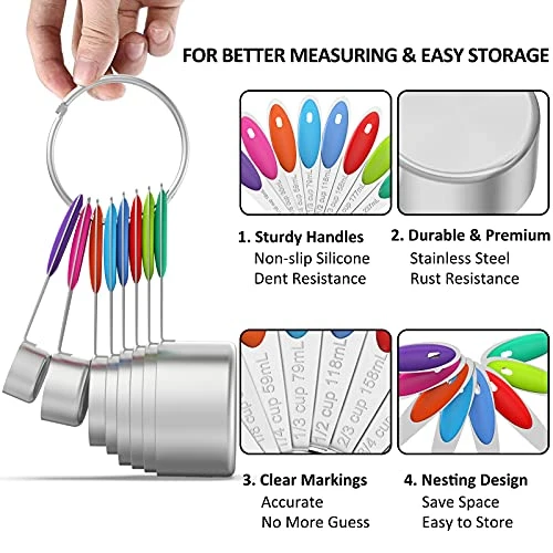 - 🌻[ENGRAVED MEASUREMENT] Each cup and spoon’s “ml” and cup sizes have passed clearly engraved marking, and you can quickly identify the cup scale according to the color of the handle. No more guess in kitchen!