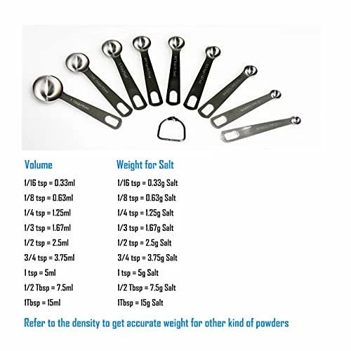 - โ Measuring Scale: 1/16tsp, 1/8 tsp, 1/4tsp, 1/3tsp, 1/2tsp, 3/4tsp, 1tsp, 1/2Tbsp, 1Tbsp, come with unit ml on the spoon, set of 9