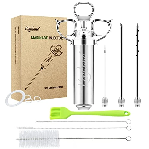- [PACKAGE INCLUDE] Kendane meat injector with 1x 2-OZ capacity flavor injector barrel, 3x professional marinade needles, 4x spare syringe silicone O-rings, 3x cleaning brushes, 1 x silicone BBQ basting brush and 1x instruction