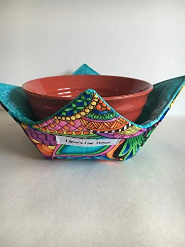 Set of 4 Microwave Safe Bowl Cozies. Add a bowl of soup, place in the microwave and heat. When done, grab two corners, lift out, no burned fingers or fear of dropping the bowl. These are perfect for Rachael Ray soup bowls. These are made with a really fun fabric. All different colors with a coordinating fabric inside. Made of all cotton fabric. Measures approximately 7″ x 7″. Machine wash and dry.