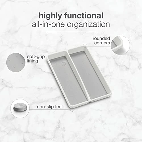 - STAYS IN PLACE: Soft-grip surface lining and sturdy nonslip rubber feet keep items neatly in place while ensuring that the organizer won’t move around as you open and close the drawer
