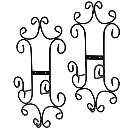 Display your decorative plates, teacups, mugs, and other elegant dishes, with these wall mounted plate display racks. Featuring an elegant scrollwork design and sophisticated classic matte black finish, these wall mounted plate racks are perfect for any décor style in your kitchen, dining room, retail setting or showroom. Top rack is ideal for decorative plates, saucers, or platters and a bottom hook provides space for matching teacups, mugs or even dishtowels. Easily mounted to most wall surfaces with provided mounting hardware (includes drywall anchors and standard screws) to create a wall display of your fine china, porcelain and heirlooms to be featured. Coming in a set of two, these wall mounted plate holder racks provide excellent display space for any of your dishes to be featured and elegantly displayed.