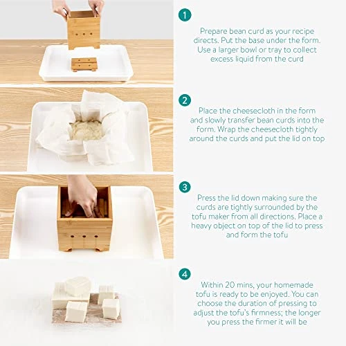 - HOW TO USE: Use your favorite recipe to prepare bean curd. Use the included cheesecloth to line the form, fill with curds, and drain. The curds are now ready to form and press into a tofu block. Your homemade tofu is ready in 20 minutes.