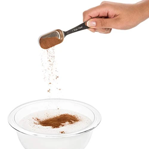 - Easy to use – The measuring spoon and cups set features a flat base design for stability and a long, sturdy, and thick handle that allows an easy reach to hard spaces like jars and deep containers. Each piece have easy to read engraved markings which will never fade. Nesting cups and spoons ensure easy, compact storage. Nesting cups and spoons ensure easy, compact storage.