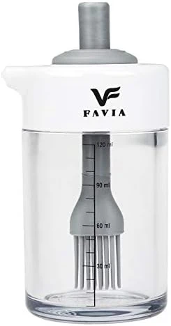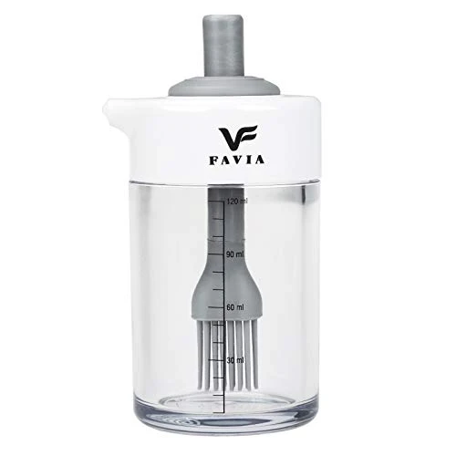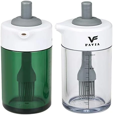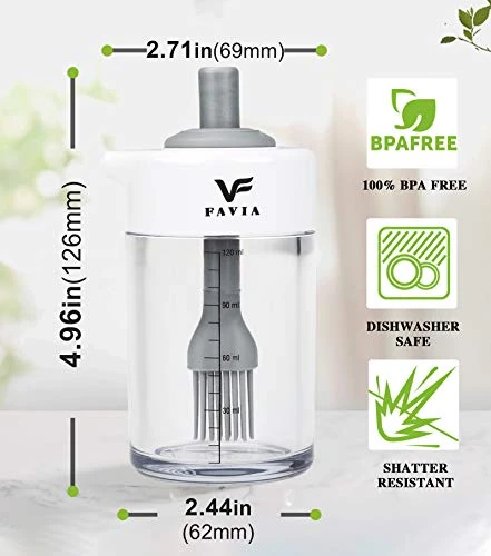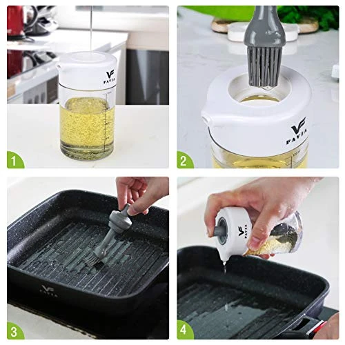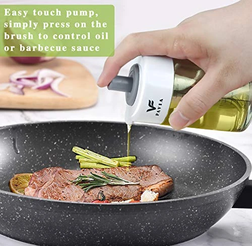 - PREMIUM MATERIAL —This oil dispenser is made of sturdy, durable BPA-free ABS plastic. The included brush is made of premium food-grade silicone that won’t melt, warp, mold, break or fall off, helping you pour evenly and apply oil, butter, sauces, and marinades effortlessly. With a silicone brush secured on the lid, use the brush to glaze and oil on your ingredients like steaks, ribs, fish, pastries and veggies.