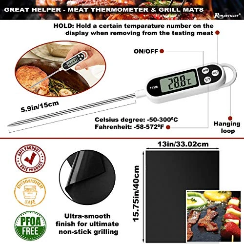 - ใCOMPLETE & LIGHTWEIGHT BBQ TOOL KITใ Complete 26pcs barbecue set combines with spatula, tong, thermometer, grill fork, knife, corn holders, skewers, pepper shakers, silicone basting brush, grill mat, glove, cleaning brush with extra head and carrying bag for all your needs. Lightweight yet easy to carry for outdoor camping barbecue!