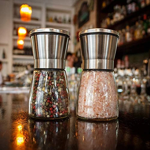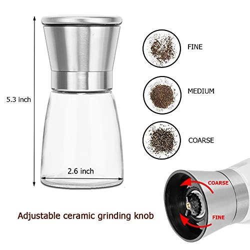 - Convenient: Manually operated, no batteries needed. Each grinder is 5.3inch tall,2.6inch wide,fits in your hand perfectly.You will not feel uncomptable and tired when you grinding.The wide opening glass body ensures you to fill your spices easily.