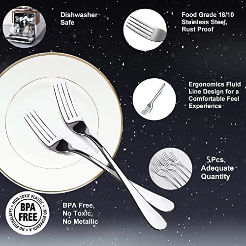 - 【Widely Application】: Our stainless steel fork set contains 5 forks, They are suitable for appetizers, salad, dessert, fruit, cake. Also, ideal for pasta, steak, fish, chicken, pork, and other dishes.