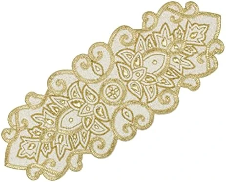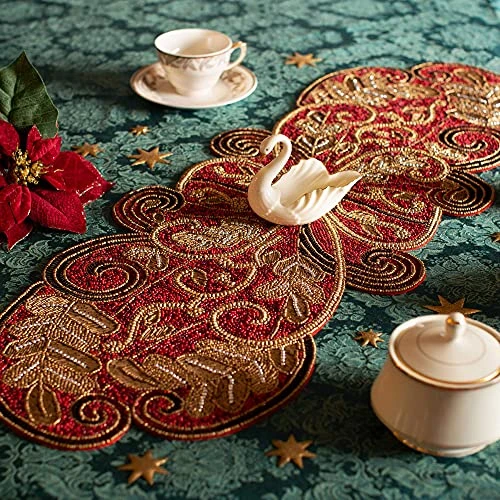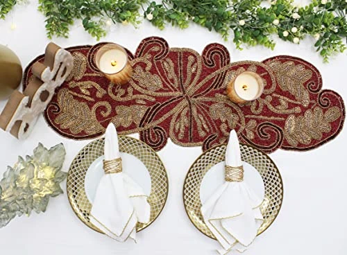 - INCLUDES: One COTTON CRAFT Scarlett Leaves Beaded Table Runner, 13 inch x 36 inch – Red & Gold