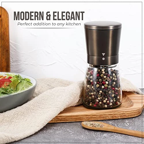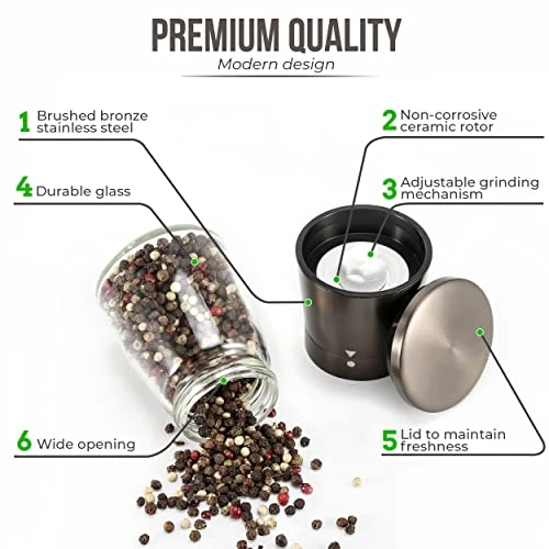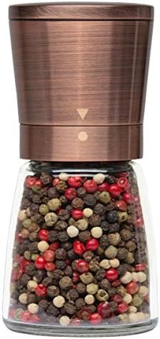 - โ PREMIUM QUALITY โ Our pepper or salt mill has a MODERN AND ELEGANT design. The copper plated brushed stainless steel grinder with high-quality glass body and non-corrosive ceramic blades is the perfect addition to any kitchen.