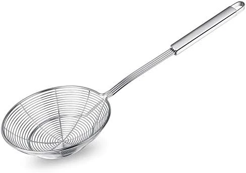 - Wired strainer Spoon: the spider web bowl helps you take food out of hot oil or water safely, catches food securely while releasing oil and and other residue. Perfect for frying foods, like potato chips, chicken legs, and scoop up noodles, spaetzli, pasta, spaghetti and more.