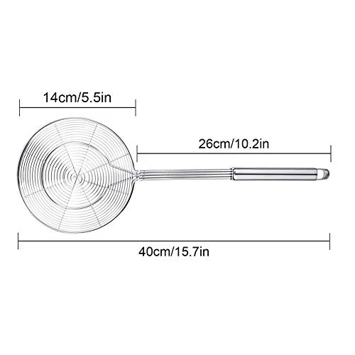 - Long handle strainer: total length: 15. 7Inch(40cm); the scoop diameter: 5. 5Inch(14cm); the handle length: 10. 2Inch(26cm); the perfect length to protect your hand and arm from boiled water or oil while not exhausting your arm.