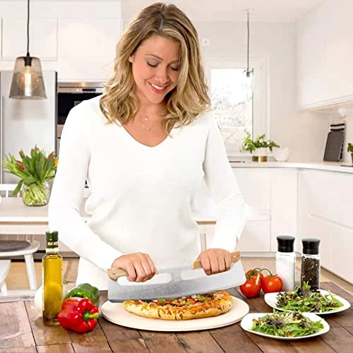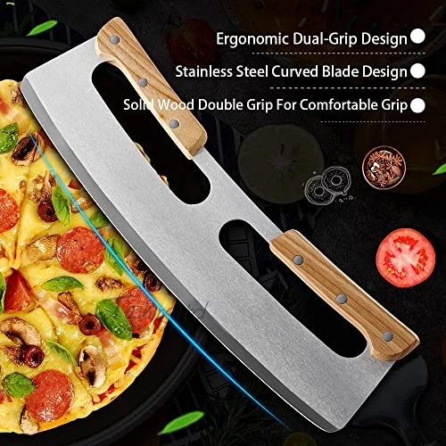 - [ERGONOMICAL HANDLE DESIGN] – The pizza knife adopt the ergonomic double wood handle helps you cut pizza quickly and comfortably without causing any discomfort to your wrist, the unique double handles make it comfortable in hand and save strength.