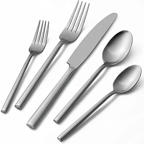 - DESIGN AND APPEARANCE:Classic round handle shape with mirror finish, natural and elegant design.Smooth and silk surface without grain, easy to clean and care in daily use. Crafted forged process,strong and durable,so that the flatware set has a thicker texture.