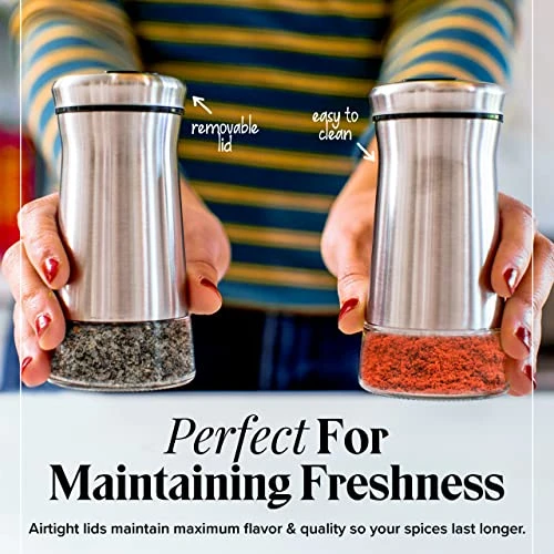 - EASY REFILLING WITH NO MESSES Don’t you hate constantly having to refill your salt and pepper shakers? Standing about 4.5 inches tall and holding 1/2 cup of spices, this set is the perfect size to cut down on constant refills without being bulky. When you do have to refill, the clear glass bodies will let you know when it’s time! The stainless steel top easily screws off revealing a wide opening for easy and mess free refills.