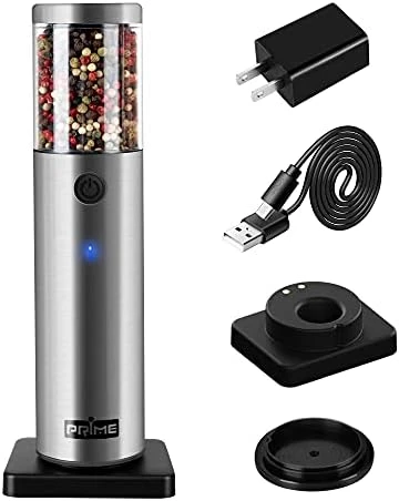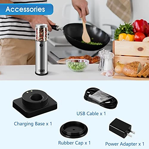 - โบ Suitable for all kitchens and dining tables: The charging base is designed as a tray for the grinder to help keep kitchen surfaces cleaner and tidier. Charging base and USB cable, power adapter are separable structure. The charging base can be placed anywhere as a tray for the grinder. If there is a power socket nearby, you can keep the grinder always fully charged. When you use the grinder outdoors, you can install the rubber cover on the bottom of the grinder.