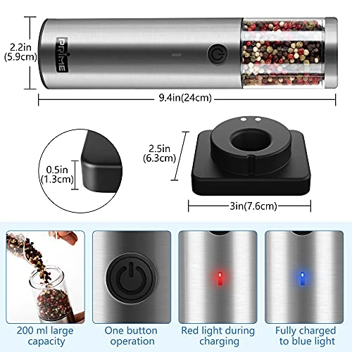 - โบ Meticulous design: This rechargeable pepper mill has a big and wide mouth spice container, acrylic body (BPA-FREE). It is very convenient to refill spices. The 200ml (6.8 oz) large-capacity spice container eliminates the need to refill the spices frequently. Turn the grinder knob on the bottom of the device to adjust the coarseness you like. There is a blue LED light on the bottom of the grinder. With the help of the LED light, you can observe the amount of spices on the food at any time.