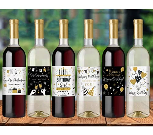 Printed Party Birthday Wine Bottle Labels, Black And Gold, Set Of 6