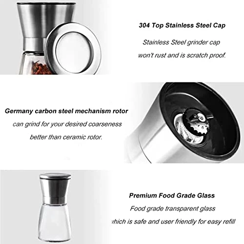 - ✅✅Premium Food Grade Glass and Stainless Steel Cap- Refillable pepper grinder with food grade transparent glass which is safe and user friendly for easy refill. Stainless Steel grinder cap won’t rust and is scratch proof.