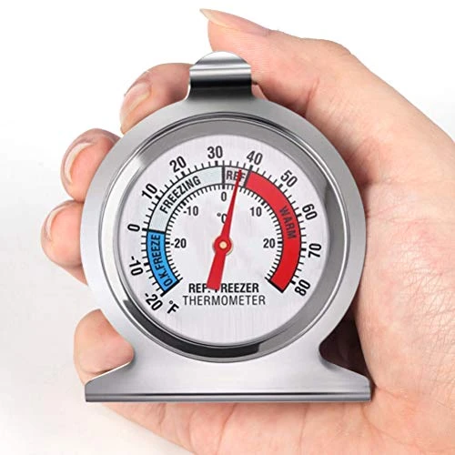 - 【CONVINIENT USE】Mechanical thermometer reads instantly and no batteries required. The refrigerator temperature thermometer has a hook and panel design, it can be placed on the shelf or hang on the rack through the top hanger. The wide base of the refrigerator thermometer allows it to remain stationary on any flat surface or on a particular drawer in a refrigerator or freezer.