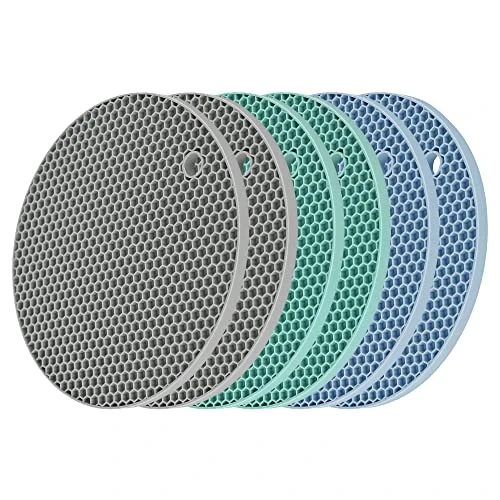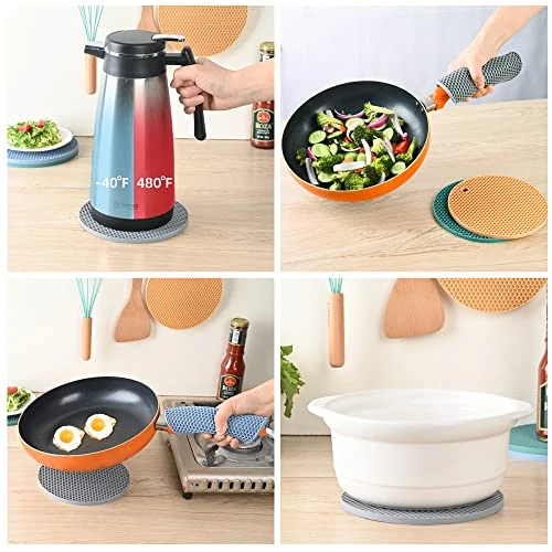 Environmentally friendly, low-carbon, Healthier and safer than common materials. - EASY TO CLEAN AND STORE SILICONE TRIVETS: Use a brush and soapy water or wash in the dishwasher.