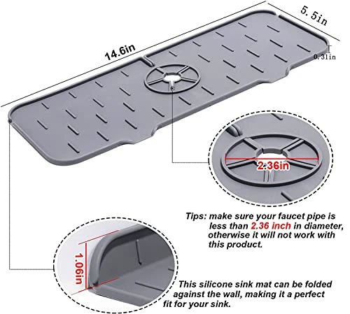 - 【Perfect Size】: 14.6″ x 5.5″ x 0.31″, 2.5″ diameter tap hole. No more tedious drying process. Make your kitchen sink upgrade effortless! These nifty kitchen sink accessories fit snugly around your faucet, reducing splashy dishes. That means there are no puddles to clean and no water spots on the faucet.
