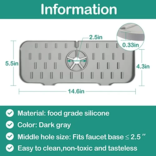 - Product Size: The silicone sink faucet pad is 14.6 x 5.5 inches, the diameter of the middle hole is adjustable, and it fits most common faucet pipes on the market.