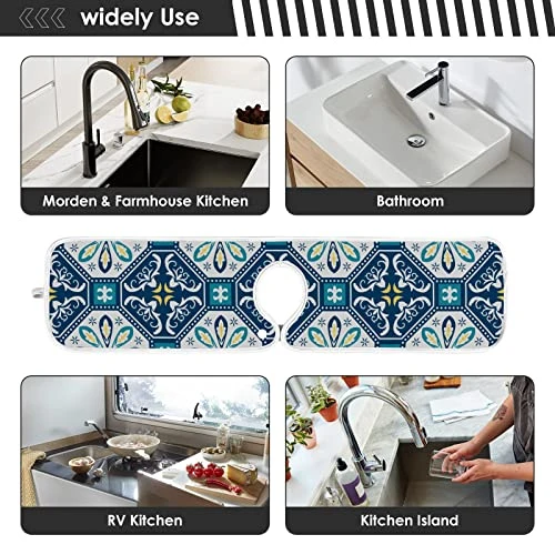 - Easy to use: the opening of the tap hole is designed with a snap button, and faucet mat with hole in middle is fixed on the tap base, so sink faucet mat will not slide easily.Kitchen faucet mat can be widely used in kitchen countertops, bathroom sinks, RV kitchens or camping.Drying mat for kitchen sink are also ideal gifts for friends or family