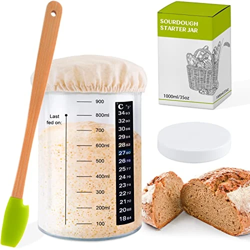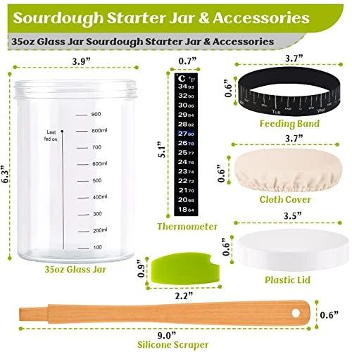 - ✔What’s in box – 1000ml / 35 oz Fermentation jar with sealed lid and cloth cover, silicone spatula to easily mix and stir, thermometer to monitor the best temperature of the jar which is used to store yeast starter. The feeding date tracker band is easy to remember when to feed the starter.
