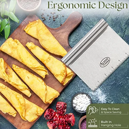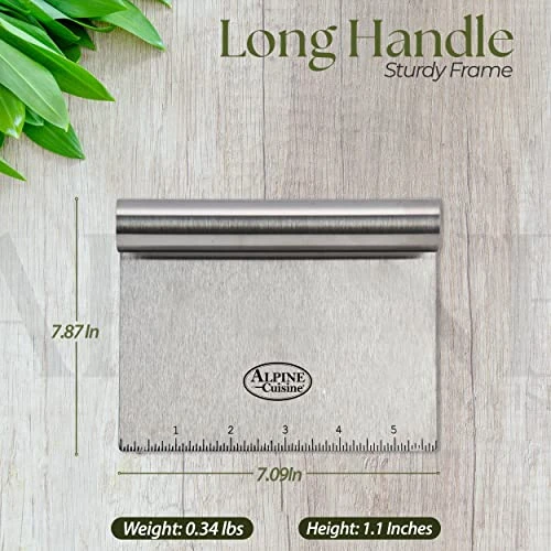 - PRECISE MEASUREMENT: The Alpine Cuisinebench scraper kitchen measures inches and centimeters, down to millimeters. For your most precise recipes, get the best measurement tool down. Metric or imperial, get it all with the chef’s best baking tool. The ergonomic handle of the kitchen scraper is made to fit comfortably in your hand so you can focus on cutting, dicing, measuring, and separating with ease.